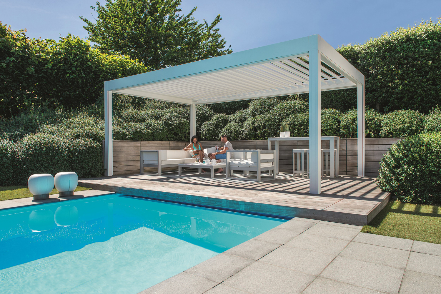 De Renson Camargue, vrijstaand of gemonteerd tegen de gevel is een échte blikvanger in uw tuin. Het lamellendak biedt bescherming tegen zon, wind en regen zodat u er elk seizoen gebruik van kan maken.