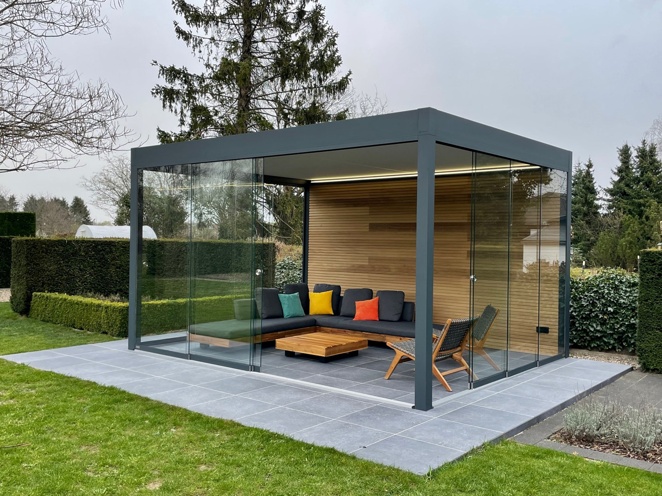 Er zijn talloze mogelijkheden op vlak van kleur en stijl. Glazen schuifwanden, screens en zijwanden maken het geheel compleet.